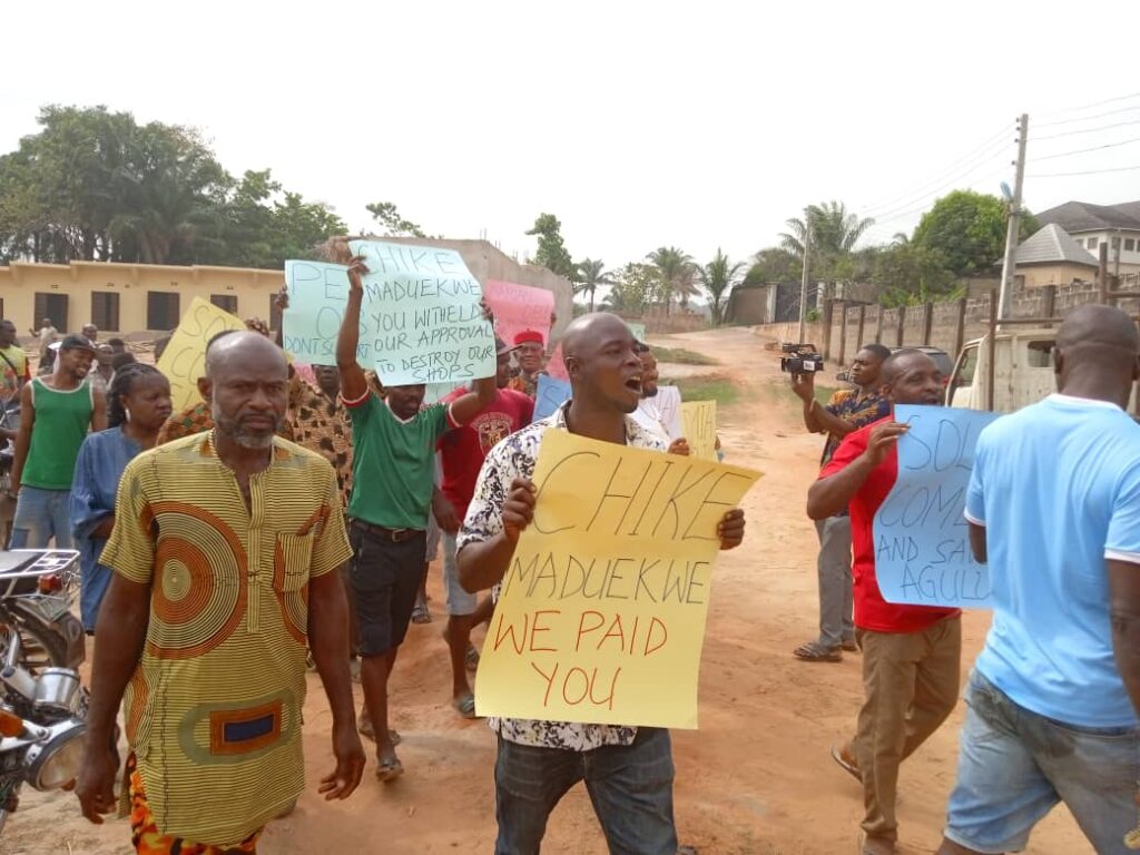 Community leaders and shop owners on Saturday staged a peaceful protest over recent demolition of a section of new building materials lockup shops at Nkwo Market Agulu, Anaocha Local Government Area of Anambra State.