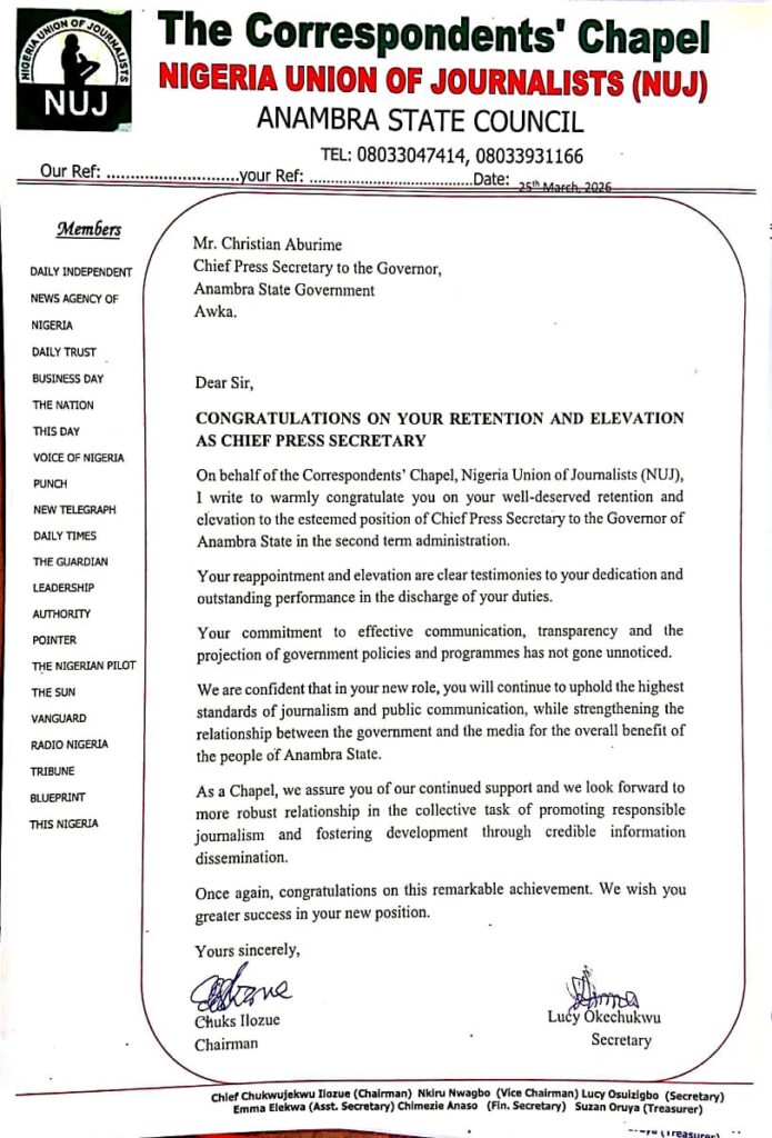 The Correspondents’ Chapel of the Nigeria Union of Journalists (NUJ), Anambra State, has congratulated Mr Christian Aburime on his retention and elevation as Chief Press Secretary to Gov. Chukwuma Soludo’s second term administration.