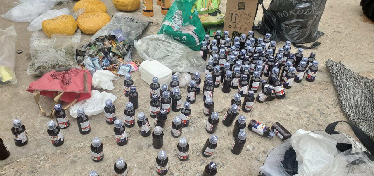 Items recovered during the raid include Tramadol, Indian hemp, nitrous oxide, Rohypnol, and a locally made single-barrel shotgun.