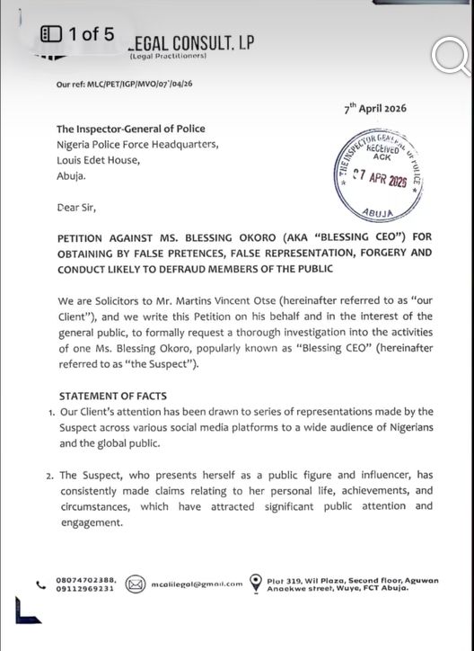 A petitioner, Mr. Martins Vincent Otse, popularly known as Verydarkman, has urged relevant authorities to investigate alleged offences of obtaining by false pretences, false representation, forgery and conduct likely to defraud the public against Ms. Blessing Okoro, also known as “Blessing CEO.”