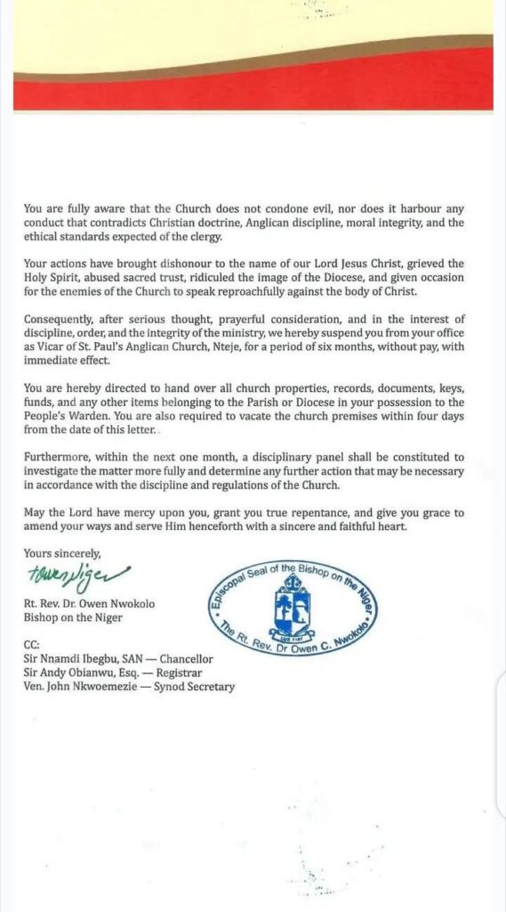 In a suspension signed by the Bishop on the Niger, it was stated the suspension of Rev Ifunaya Maduka is due to his involvement in practices grossly unbecoming of an ordained priest of the Anglican Communion.